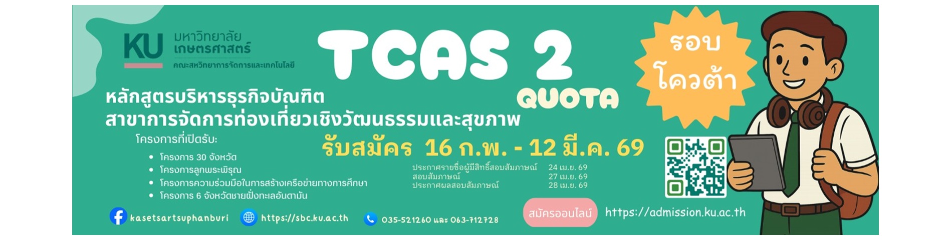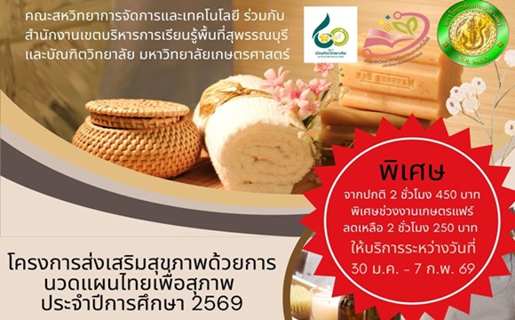 - ส่งเสริมสุขภาพด้วยการนวดแผนไทยเพื่อสุขภาพ👨👨👧👧 คณะสหวิทยาการจัดการและเทคโนโลยี ร่วมกับ สำนักงานเขตบริหารการเรียนรู้พื้นที่สุพรรณบุรี มหาวิทยาลัยเกษตรศาสตร์ ร่วมจัดโครงการ ส่งเสริมสุขภาพด้วยการนวดแผนไทยเพื่อสุขภาพ ประจำปี 2569 ระหว่างวันที่ 30 ม.ค. - 7 ก.พ. 2569🏨 สถานที่ ณ… Read more: ส่งเสริมสุขภาพด้วยการนวดแผนไทยเพื่อสุขภาพ